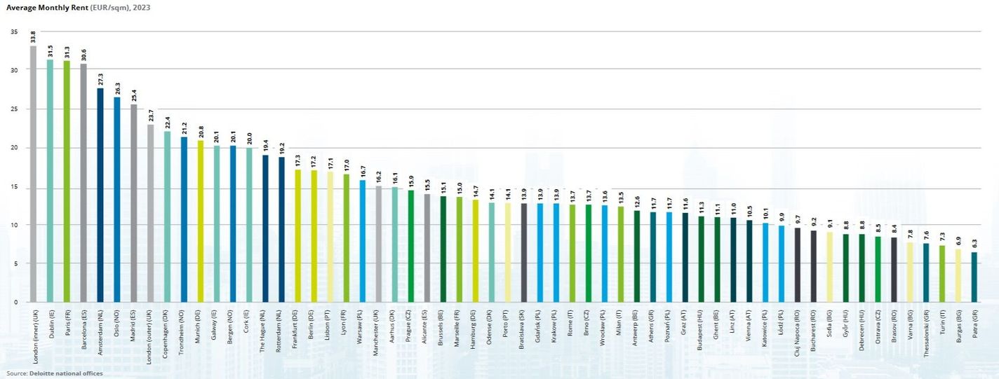 Dublin (€31.5/m²) and Paris (€31.3/m²) are also in the top tier.
